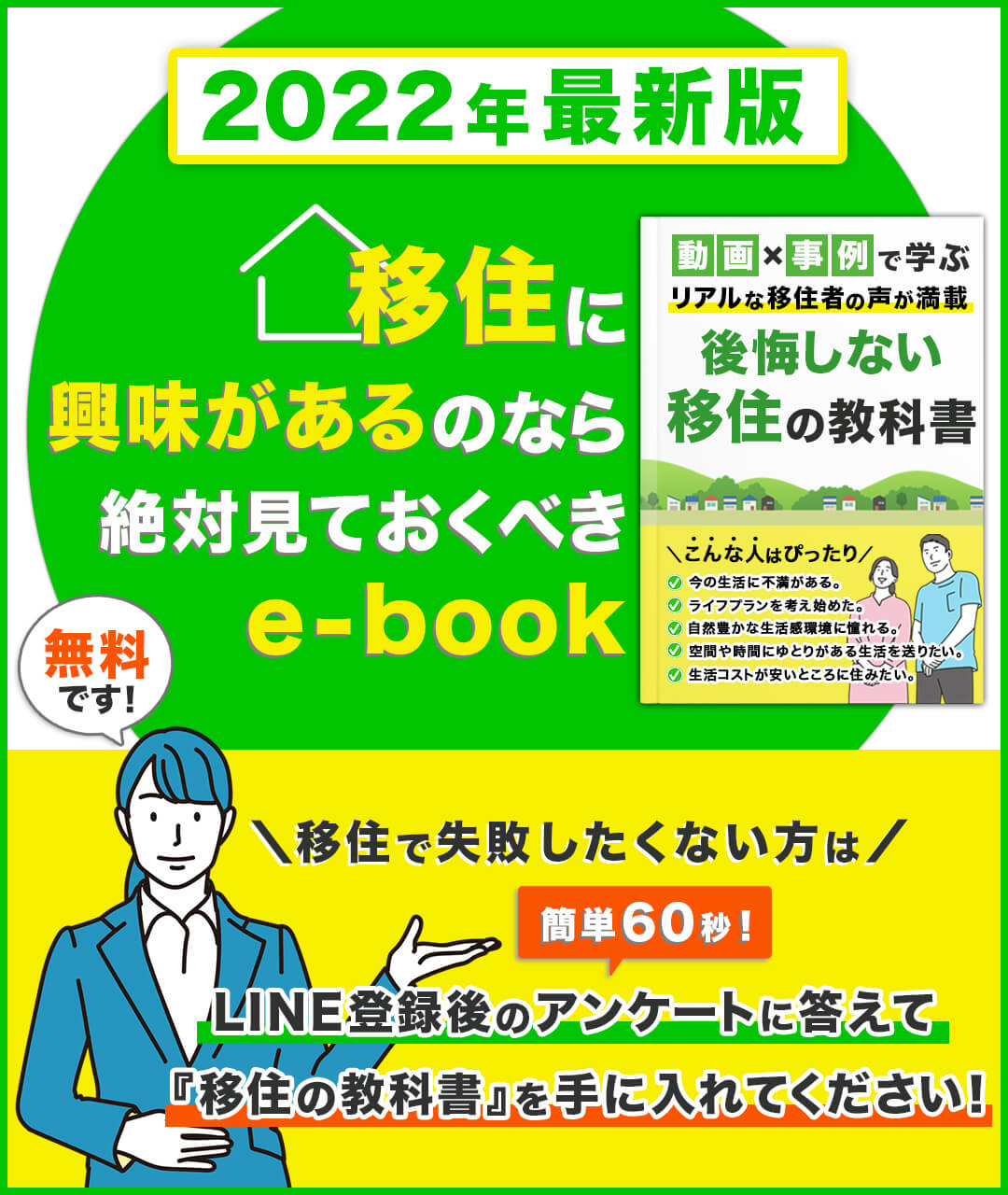 この教科書は、移住の窓口をご利用いただいた方の実際の声を元に作成している、失敗しないための移住の手引きです。LINEご登録と簡単なアンケートへご協力頂いた方へ無料でプレゼントしております。